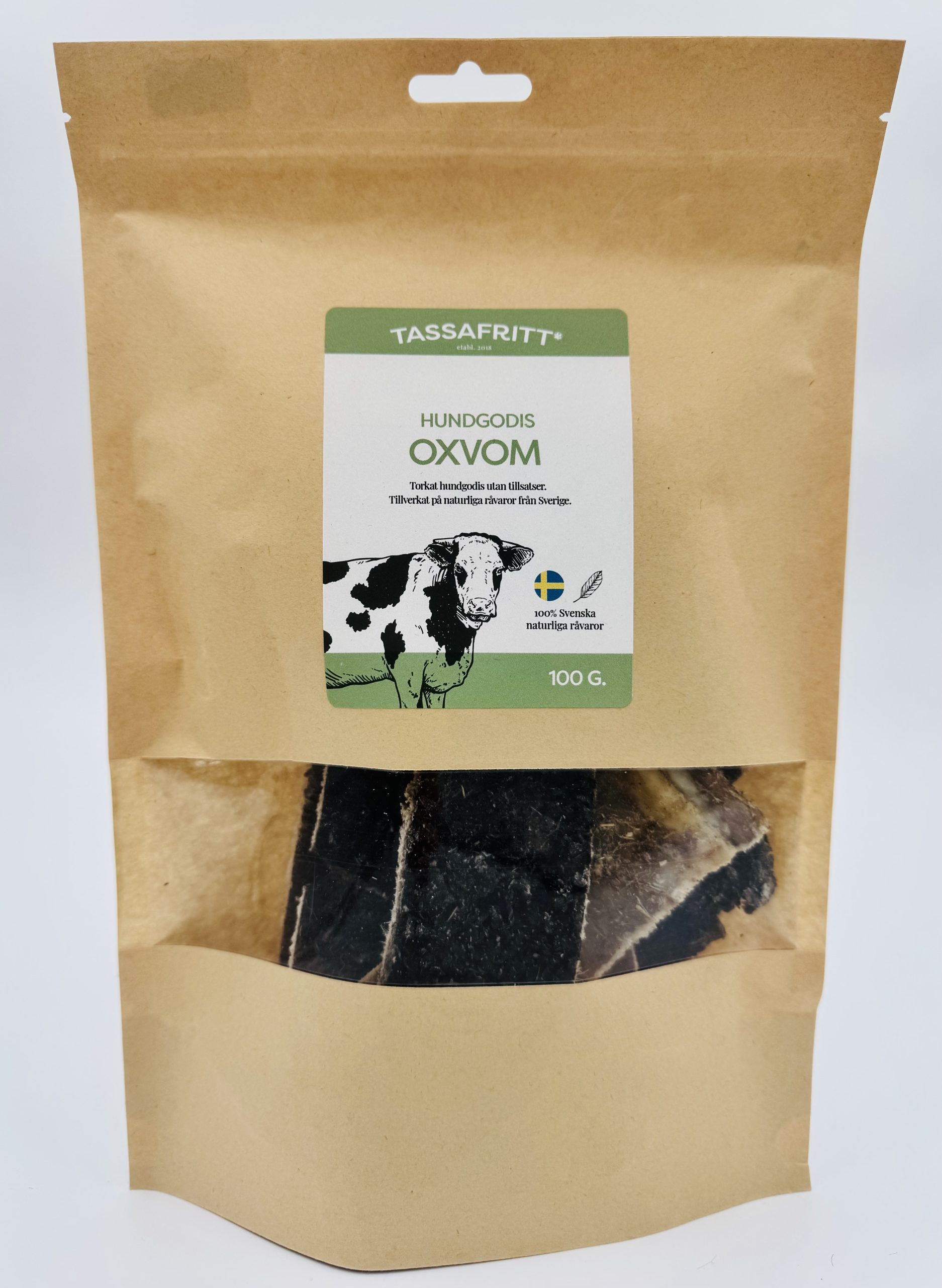 Produkten: Torkad oxvom som är naturlig och utan tillsatser, tillverkad i Sverige.